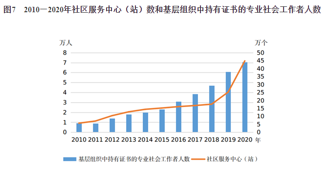 2.兒童社會(huì)環(huán)境不斷優(yōu)化?!毒V要》實(shí)施以來(lái),城鄉(xiāng)社區(qū)服務(wù)體系建設(shè)大力推進(jìn),依托城鄉(xiāng)社區(qū)設(shè)立的兒童之家成為守護(hù)兒童健康成長(zhǎng)的“第二家”。截至2020年底,全國(guó)共有社區(qū)服務(wù)中心(站)44.8萬(wàn)個(gè)(見(jiàn)圖7),是2010年的7.9倍;共有兒童之家(或兒童中心)32.1萬(wàn)個(gè)[7],是2012年[8]的6.7倍;基層組織中持有證書(shū)的專(zhuān)業(yè)社會(huì)工作者7.1萬(wàn)人,是2010年的7.8倍。