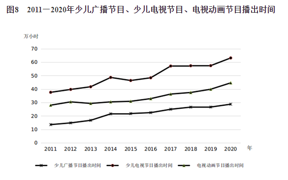 3.兒童文化產(chǎn)品供給日益豐富?!毒V要》實(shí)施以來(lái),面向青少年兒童的優(yōu)質(zhì)文化產(chǎn)品不斷增加,青少年兒童日益增長(zhǎng)的文化需求逐步得到滿(mǎn)足。2020年,全國(guó)出版初中及以下少年兒童圖書(shū)4.3萬(wàn)種9.0億冊(cè)(張),出版初中及以下少年兒童期刊209種3.3億冊(cè)。全國(guó)3212個(gè)公共圖書(shū)館共有少兒文獻(xiàn)1.5億冊(cè),是2011年的4.9倍。全國(guó)少兒廣播節(jié)目、少兒電視節(jié)目、電視動(dòng)畫(huà)節(jié)目播出時(shí)間分別為28.8萬(wàn)小時(shí)、63.1萬(wàn)小時(shí)和44.6萬(wàn)小時(shí)(見(jiàn)圖8),分別是2011年的2.1倍、1.7倍和1.6倍。全國(guó)未成年人參觀博物館1.2億人次。