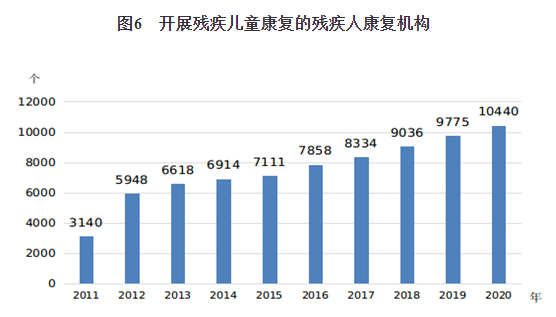 3.殘疾兒童康復(fù)服務(wù)水平顯著提升?!毒V要》實(shí)施以來(lái),國(guó)家先后實(shí)施殘疾兒童搶救性康復(fù)項(xiàng)目、殘疾兒童康復(fù)救助制度,目前全國(guó)殘疾兒童康復(fù)救助政策體系、工作體系和服務(wù)網(wǎng)絡(luò)全面建立,為開(kāi)展殘疾兒童康復(fù)救助提供了有力保障。截至2020年底,全國(guó)開(kāi)展殘疾兒童康復(fù)的殘疾人康復(fù)機(jī)構(gòu)10440個(gè)(見(jiàn)圖6),比2011年增加7300個(gè)。2020年,全國(guó)共有23.7萬(wàn)名0—6歲殘疾兒童接受了基本康復(fù)服務(wù),比2016年[6]增加8.7萬(wàn)人,接受基本康復(fù)服務(wù)的殘疾人中0—6歲殘疾兒童比重為2.2%。