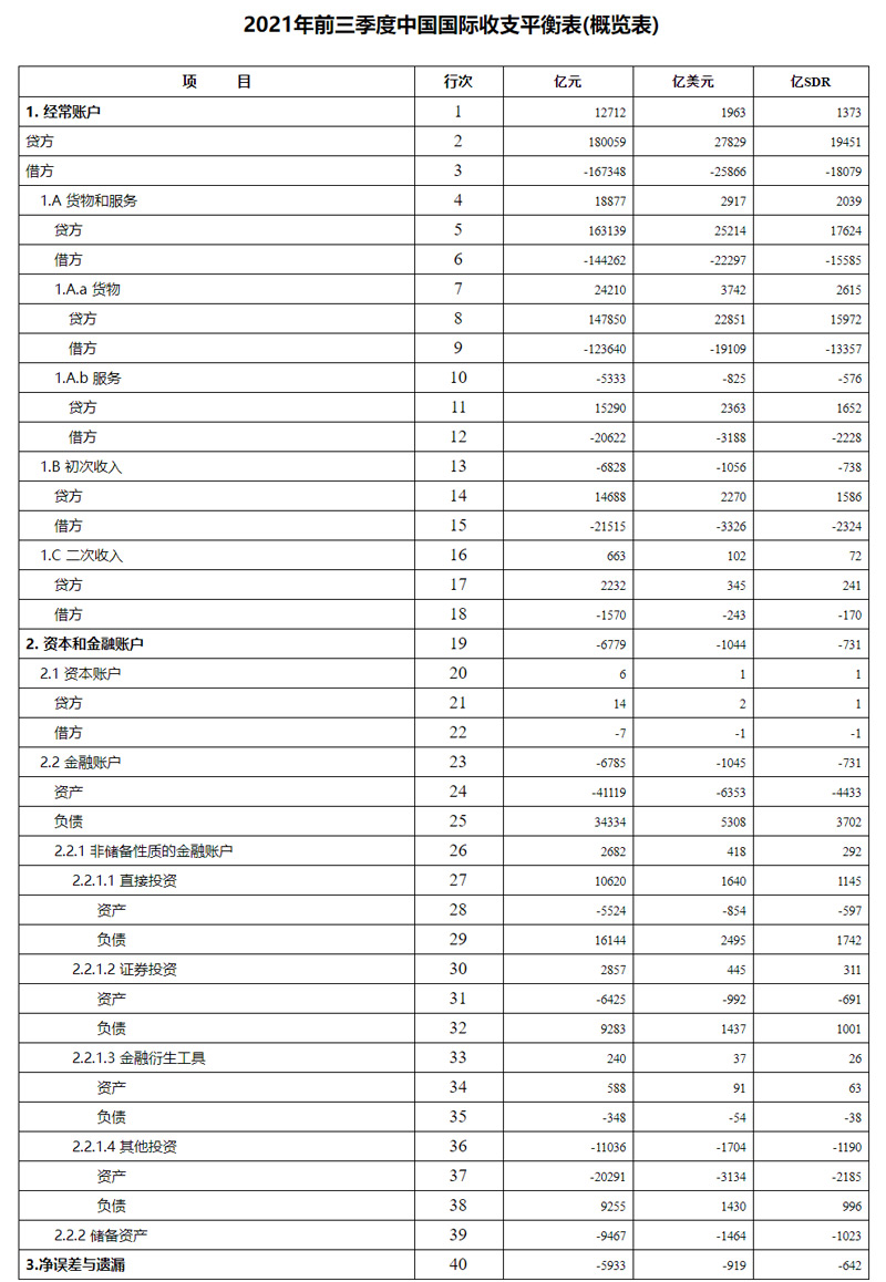 按SDR計值,2021年前三季度,我國經常賬戶順差1373億SDR;資本和金融賬戶逆差731億SDR,其中,非儲備性質的金融賬戶順差292億SDR,儲備資產增加1023億SDR。