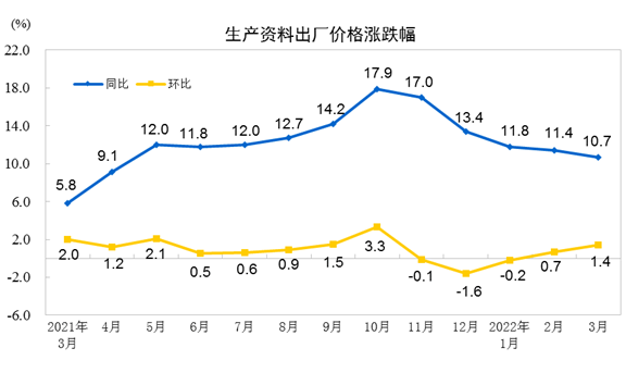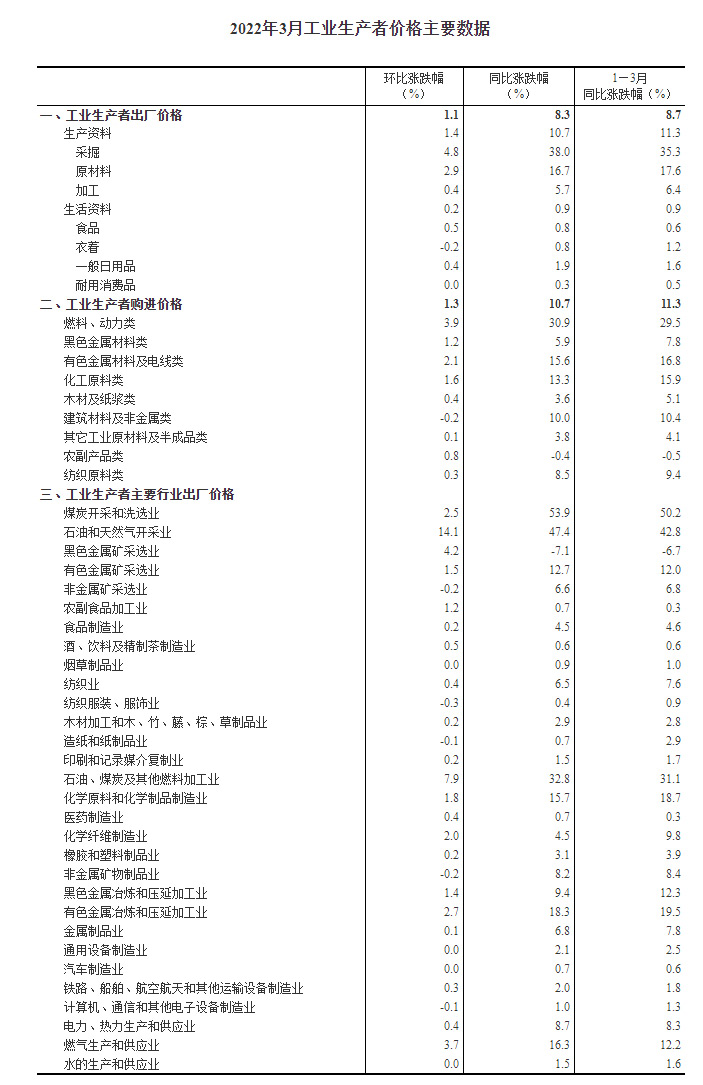 2022年3月份,全國工業(yè)生產(chǎn)者出廠價(jià)格同比上漲8.3%,環(huán)比上漲1.1%;工業(yè)生產(chǎn)者購進(jìn)價(jià)格同比上漲10.7%,環(huán)比上漲1.3%。一季度,工業(yè)生產(chǎn)者出廠價(jià)格比去年同期上漲8.7%,工業(yè)生產(chǎn)者購進(jìn)價(jià)格上漲11.3%。