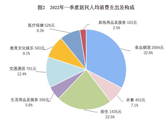 一季度,全國居民人均食品煙酒消費支出2084元,增長4.9%,占人均消費支出的比重為32.6%;人均衣著消費支出453元,增長3.6%,占人均消費支出的比重為7.1%;人均居住消費支出1435元,增長6.7%,占人均消費支出的比重為22.5%;人均生活用品及服務消費支出356元,增長4.8%,占人均消費支出的比重為5.6%;人均交通通信消費支出791元,增長12.7%,占人均消費支出的比重為12.4%;人均教育文化娛樂消費支出583元,增長6.9%,占人均消費支出的比重為9.1%;人均醫(yī)療保健消費支出528元,增長9.1%,占人均消費支出的比重為8.3%;人均其他用品及服務消費支出163元,增長17.1%,占人均消費支出的比重為2.5%。
