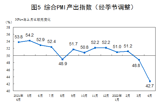4月份,綜合PMI產(chǎn)出指數(shù)為42.7%,比上月下降6.1個(gè)百分點(diǎn),低于臨界點(diǎn),表明我國(guó)企業(yè)生產(chǎn)經(jīng)營(yíng)景氣水平下降幅度加大。