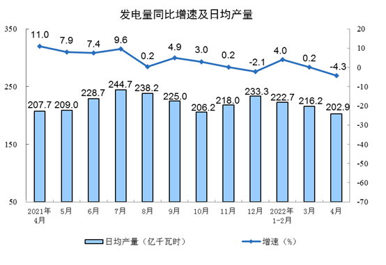 分產(chǎn)品看,4月份,617種產(chǎn)品中有169種產(chǎn)品產(chǎn)量同比增長。鋼材11483萬噸,同比下降5.8%;水泥19471萬噸,下降18.9%;十種有色金屬553萬噸,增長0.3%;乙烯218萬噸,下降1.3%;汽車128.2萬輛,下降43.5%,其中,新能源汽車33.0萬輛,增長42.2%;發(fā)電量6086億千瓦時,下降4.3%;原油加工量5181萬噸,下降10.5%。