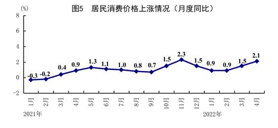 1-4月份,全國(guó)居民消費(fèi)價(jià)格(CPI)同比上漲1.4%。4月份,全國(guó)居民消費(fèi)價(jià)格同比上漲2.1%,漲幅比上月擴(kuò)大0.6個(gè)百分點(diǎn);環(huán)比上漲0.4%。分類別看,食品煙酒價(jià)格同比上漲1.9%,衣著價(jià)格上漲0.5%,居住價(jià)格上漲1.2%,生活用品及服務(wù)價(jià)格上漲1.2%,交通通信價(jià)格上漲6.5%,教育文化娛樂(lè)價(jià)格上漲2.0%,醫(yī)療保健價(jià)格上漲0.7%,其他用品及服務(wù)價(jià)格上漲1.7%。在食品煙酒價(jià)格中,糧食價(jià)格上漲2.7%,鮮果價(jià)格上漲14.1%,鮮菜價(jià)格上漲24.0%,豬肉價(jià)格下降33.3%??鄢称泛湍茉磧r(jià)格后的核心CPI同比上漲0.9%,漲幅比上月回落0.2個(gè)百分點(diǎn)。