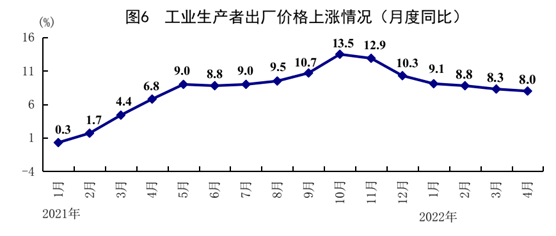 1-4月份,全國(guó)工業(yè)生產(chǎn)者出廠價(jià)格和購(gòu)進(jìn)價(jià)格同比分別上漲8.5%和11.2%。4月份,全國(guó)工業(yè)生產(chǎn)者出廠價(jià)格同比上漲8.0%,漲幅比上月回落0.3個(gè)百分點(diǎn);環(huán)比上漲0.6%。全國(guó)工業(yè)生產(chǎn)者購(gòu)進(jìn)價(jià)格同比上漲10.8%,環(huán)比上漲1.3%。