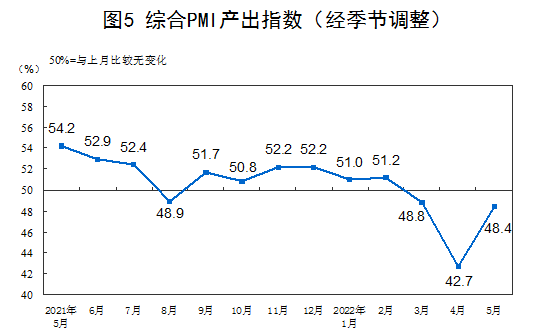 5月份,綜合PMI產(chǎn)出指數(shù)為48.4%,比上月上升5.7個百分點,表明我國企業(yè)生產(chǎn)經(jīng)營景氣水平有所恢復。