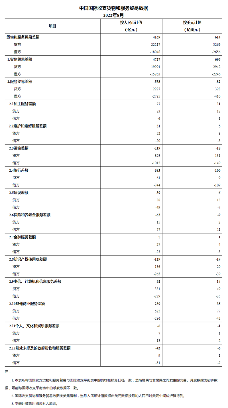2022年8月,我國(guó)國(guó)際收支貨物和服務(wù)貿(mào)易進(jìn)出口規(guī)模40265億元,同比增長(zhǎng)9%。其中,貨物貿(mào)易出口19991億元,進(jìn)口15263億元,順差4727億元;服務(wù)貿(mào)易出口2227億元,進(jìn)口2785億元,逆差558億元。服務(wù)貿(mào)易主要項(xiàng)目為:運(yùn)輸服務(wù)進(jìn)出口規(guī)模1905億元,其他商業(yè)服務(wù)進(jìn)出口規(guī)模811億元,旅行服務(wù)進(jìn)出口規(guī)模804億元,電信、計(jì)算機(jī)和信息服務(wù)進(jìn)出口規(guī)模571億元。