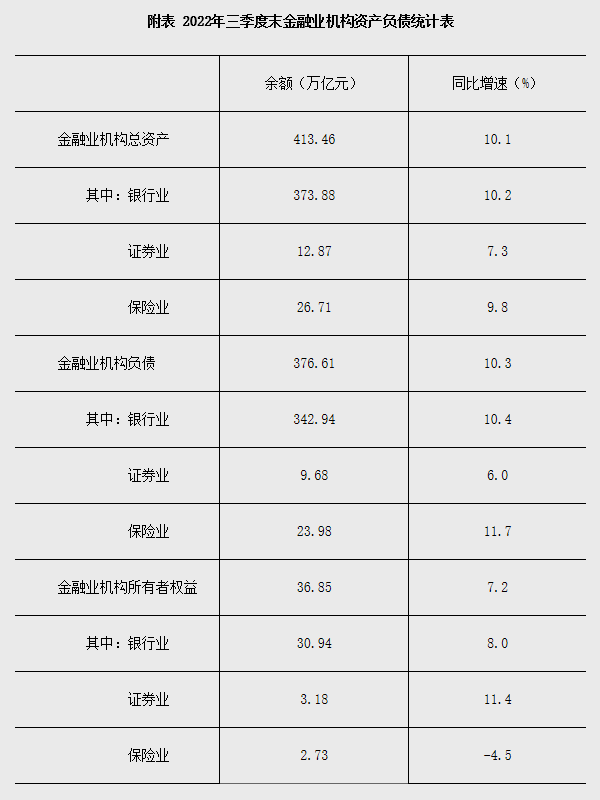 初步統(tǒng)計(jì),2022年三季度末,我國金融業(yè)機(jī)構(gòu)總資產(chǎn)為413.46萬億元,同比增長10.1%,其中,銀行業(yè)機(jī)構(gòu)總資產(chǎn)為373.88萬億元,同比增長10.2%;證券業(yè)機(jī)構(gòu)總資產(chǎn)為12.87萬億元,同比增長7.3%;保險(xiǎn)業(yè)機(jī)構(gòu)總資產(chǎn)為26.71萬億元,同比增長9.8%。