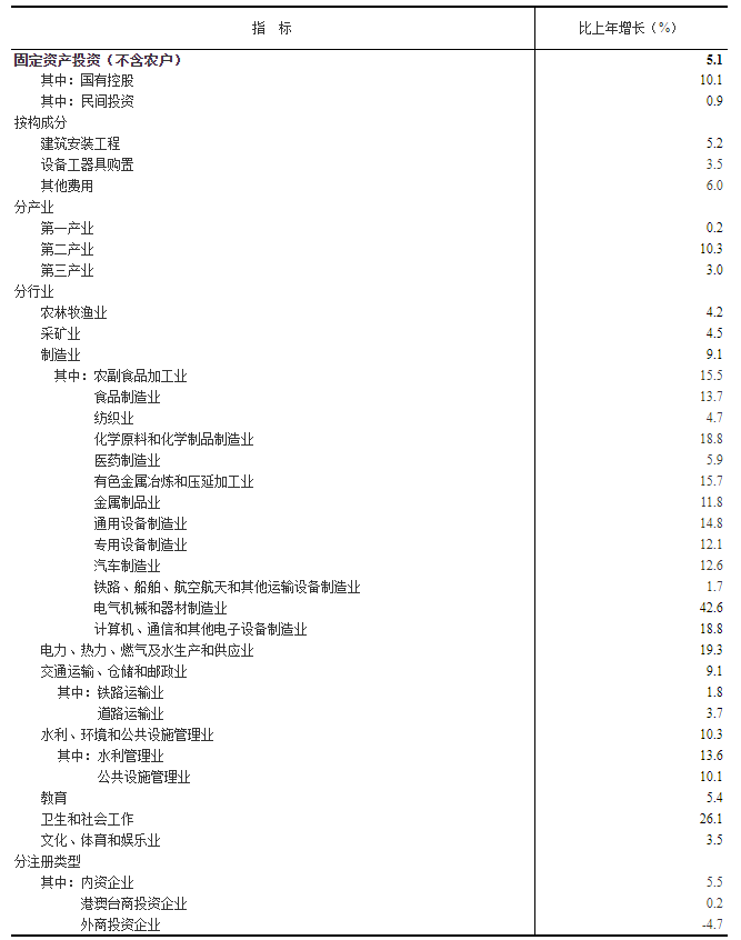 分登記注冊(cè)類型看,內(nèi)資企業(yè)固定資產(chǎn)投資比上年增長(zhǎng)5.5%,港澳臺(tái)商企業(yè)固定資產(chǎn)投資增長(zhǎng)0.2%,外商企業(yè)固定資產(chǎn)投資下降4.7%。