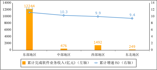 東北部地區(qū)軟件業(yè)收入加快增長(zhǎng),東部地區(qū)增勢(shì)突出。1—2月份,東部地區(qū)完成軟件業(yè)務(wù)收入12244億元,同比增長(zhǎng)11.2%,高出全行業(yè)整體水平0.2個(gè)百分點(diǎn);中部地區(qū)完成軟件業(yè)務(wù)收入476億元,同比增長(zhǎng)10.3%;西部地區(qū)完成軟件業(yè)務(wù)收入1492億元,同比增長(zhǎng)9.9%;東北地區(qū)完成軟件業(yè)務(wù)收入249億元,同比增長(zhǎng)9.4%。四個(gè)地區(qū)軟件業(yè)務(wù)收入在全國(guó)總收入中的占比分別為84.7%、3.3%、10.3%和1.7%。