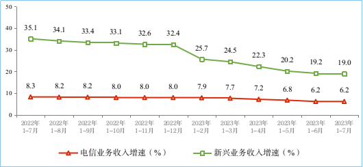 語音業(yè)務(wù)收入持續(xù)下滑。1—7月份,三家基礎(chǔ)電信企業(yè)完成固定語音和移動語音業(yè)務(wù)收入111.9億元和665.9億元,同比分別下降8%和2%,在電信業(yè)務(wù)收入中總占比7.7%,占比同比回落0.7個百分點(diǎn)。