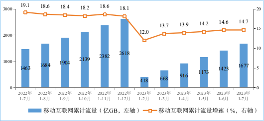 移動互聯(lián)網(wǎng)用戶戶均流量(DOU)維持高位。1—7月份,移動互聯(lián)網(wǎng)累計流量達(dá)1677億GB,同比增長14.7%,增速較上半年提升0.1個百分點(diǎn)。截至7月末,移動互聯(lián)網(wǎng)用戶數(shù)達(dá)14.94億戶,比上年末凈增4032萬戶。7月當(dāng)月戶均移動互聯(lián)網(wǎng)接入流量(DOU)達(dá)到17.03GB/戶·月,同比增長11.6%,較上年12月份高0.85GB/戶·月。