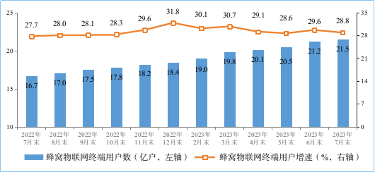 蜂窩物聯(lián)網(wǎng)用戶規(guī)模持續(xù)擴(kuò)大。截至7月末,三家基礎(chǔ)電信企業(yè)發(fā)展蜂窩物聯(lián)網(wǎng)終端用戶21.48億戶,比上年末凈增3.04億戶,占移動網(wǎng)終端連接數(shù)(包括移動電話用戶和蜂窩物聯(lián)網(wǎng)終端用戶)的比重達(dá)55.7%。IPTV(網(wǎng)絡(luò)電視)總用戶數(shù)達(dá)3.93億戶,比上年末凈增1292萬戶。