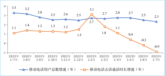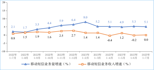 移動傳統(tǒng)業(yè)務(wù)持續(xù)收縮。1—7月份,移動電話去話通話時長完成1.31萬億分鐘,同比下降0.9%;固定電話主叫通話時長完成460.5億分鐘,同比下降4.8%。1—7月份,全國移動短信業(yè)務(wù)量同比增長5.1%,移動短信業(yè)務(wù)收入與去年同期持平,增速較上半年分別回落0.2個和提升0.2個百分點(diǎn)。
