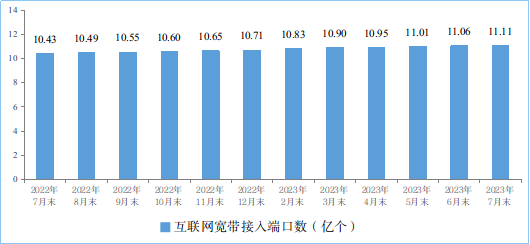 千兆光纖寬帶網(wǎng)絡(luò)方面。截至7月末,全國互聯(lián)網(wǎng)寬帶接入端口數(shù)量達(dá)11.1億個,比上年末凈增3997萬個。其中,光纖接入(FTTH/O)端口達(dá)到10.7億個,比上年末凈增4388萬個,占互聯(lián)網(wǎng)寬帶接入端口的96.2%,占比較上年末提高0.5個百分點(diǎn)。截至7月末,具備千兆網(wǎng)絡(luò)服務(wù)能力的10G PON端口數(shù)達(dá)2096萬個,比上年末凈增573.5萬個。