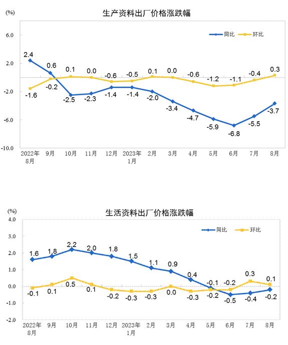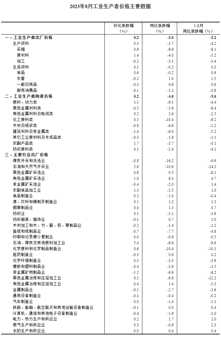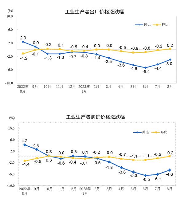 2023年8月份,全國工業(yè)生產(chǎn)者出廠價(jià)格同比下降3.0%,環(huán)比上漲0.2%;工業(yè)生產(chǎn)者購進(jìn)價(jià)格同比下降4.6%,環(huán)比上漲0.2%。1—8月平均,工業(yè)生產(chǎn)者出廠價(jià)格比上年同期下降3.2%,工業(yè)生產(chǎn)者購進(jìn)價(jià)格下降3.6%。