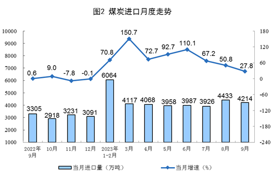 原煤生產(chǎn)保持穩(wěn)定,進(jìn)口快速增長(zhǎng)。9月份,生產(chǎn)原煤3.9億噸,同比增長(zhǎng)0.4%,增速比8月份放緩1.6個(gè)百分點(diǎn),日均產(chǎn)量1310萬(wàn)噸。進(jìn)口煤炭4214萬(wàn)噸,同比增長(zhǎng)27.8%,增速比8月份回落23.0個(gè)百分點(diǎn)。