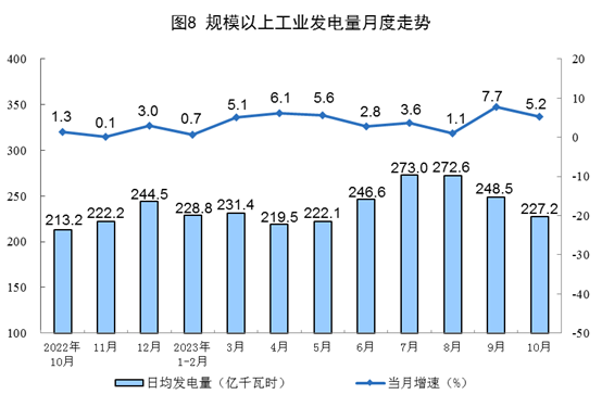 電力生產(chǎn)穩(wěn)步增長(zhǎng)。10月份,發(fā)電量7044億千瓦時(shí),同比增長(zhǎng)5.2%,增速比9月份放緩2.5個(gè)百分點(diǎn),日均發(fā)電227.2億千瓦時(shí)。1—10月份,發(fā)電量73330億千瓦時(shí),同比增長(zhǎng)4.4%。
