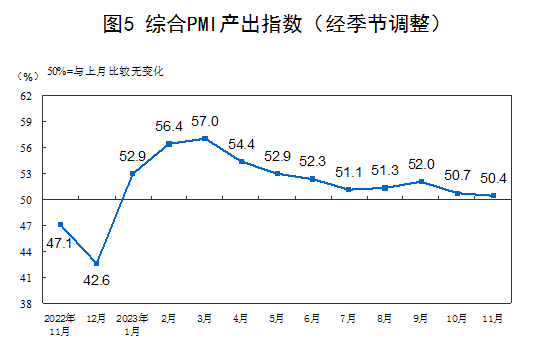 11月份,綜合PMI產(chǎn)出指數(shù)為50.4%,比上月下降0.3個(gè)百分點(diǎn),表明我國企業(yè)生產(chǎn)經(jīng)營活動(dòng)總體持續(xù)擴(kuò)張。