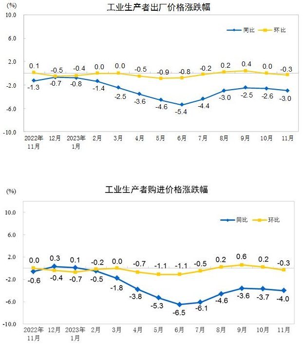 2023年11月份,全國(guó)工業(yè)生產(chǎn)者出廠價(jià)格同比下降3.0%,環(huán)比下降0.3%;工業(yè)生產(chǎn)者購(gòu)進(jìn)價(jià)格同比下降4.0%,環(huán)比下降0.3%。1—11月平均,工業(yè)生產(chǎn)者出廠價(jià)格比上年同期下降3.1%,工業(yè)生產(chǎn)者購(gòu)進(jìn)價(jià)格下降3.6%。