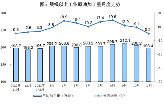 原油加工保持增長。11月份,加工原油5953萬噸,同比增長0.2%,增速比10月份回落8.9個(gè)百分點(diǎn),日均加工原油198.4萬噸。1—11月份,加工原油67622萬噸,同比增長10.1%。