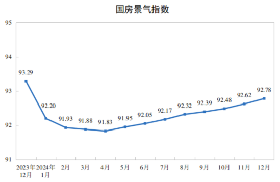 2024年12月份,房地產(chǎn)開(kāi)發(fā)景氣指數(shù)(簡(jiǎn)稱“國(guó)房景氣指數(shù)”)為92.78。