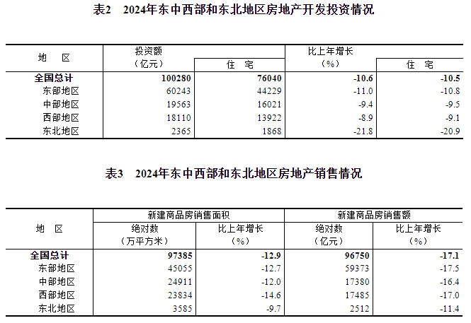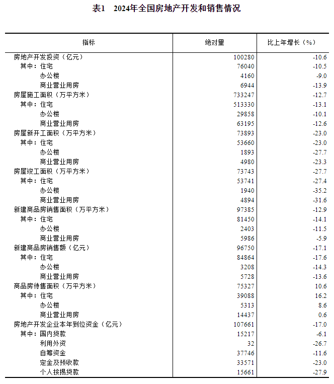 2024年,全國(guó)房地產(chǎn)開(kāi)發(fā)投資100280億元,比上年下降10.6%(按可比口徑計(jì)算,詳見(jiàn)附注6);其中,住宅投資76040億元,下降10.5%。