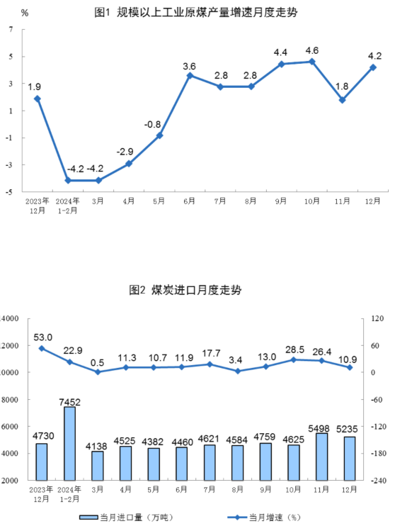 原煤生產(chǎn)增速加快。12月份,規(guī)上工業(yè)原煤產(chǎn)量4.4億噸,同比增長4.2%,增速比11月份加快2.4個(gè)百分點(diǎn);日均產(chǎn)量1415.6萬噸。進(jìn)口煤炭5235萬噸,同比增長10.9%。