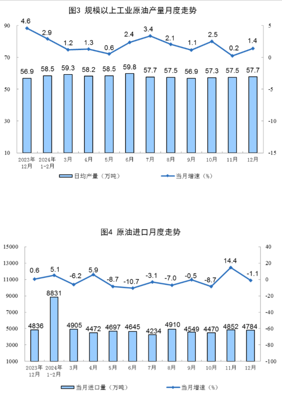 原油生產(chǎn)增速加快。12月份,規(guī)上工業(yè)原油產(chǎn)量1790萬噸,同比增長1.4%,增速比11月份加快1.2個(gè)百分點(diǎn);日均產(chǎn)量57.7萬噸。進(jìn)口原油4784萬噸,同比下降1.1%。