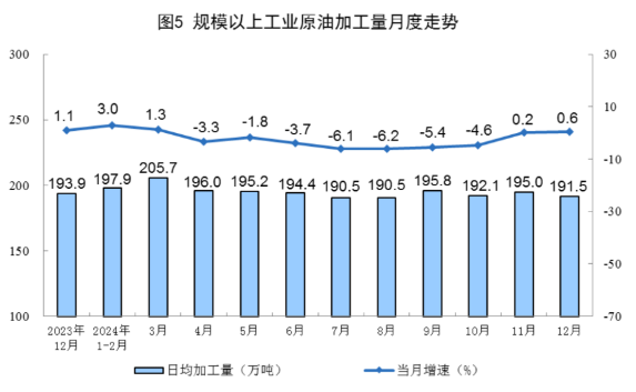 原油加工保持穩(wěn)定。12月份,規(guī)上工業(yè)原油加工量5935萬噸,同比增長0.6%,增速比11月份加快0.4個(gè)百分點(diǎn);日均加工191.5萬噸。2024年,規(guī)上工業(yè)原油加工量70843萬噸,同比下降1.6%。