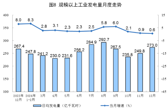 規(guī)上工業(yè)電力生產(chǎn)平穩(wěn)增長。12月份,規(guī)上工業(yè)發(fā)電量8462億千瓦時(shí),同比增長0.6%;規(guī)上工業(yè)日均發(fā)電273.0億千瓦時(shí)。2024年,規(guī)上工業(yè)發(fā)電量94181億千瓦時(shí),同比增長4.6%。