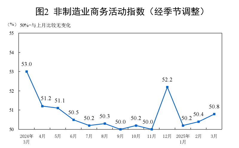 3月份,非制造業(yè)商務(wù)活動(dòng)指數(shù)為50.8%,比上月上升0.4個(gè)百分點(diǎn),非制造業(yè)擴(kuò)張步伐有所加快。