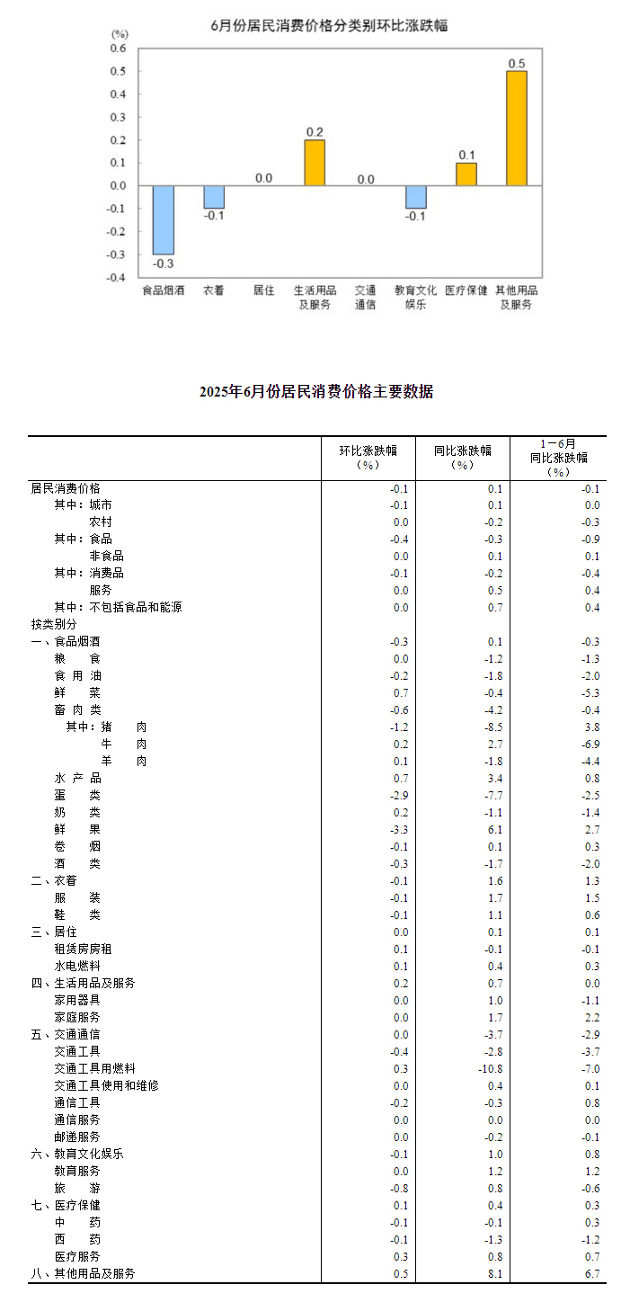 2025年6月份,全國居民消費(fèi)價(jià)格同比上漲0.1%。其中,城市上漲0.1%,農(nóng)村下降0.2%;食品價(jià)格下降0.3%,非食品價(jià)格上漲0.1%;消費(fèi)品價(jià)格下降0.2%,服務(wù)價(jià)格上漲0.5%。上半年,全國居民消費(fèi)價(jià)格比上年同期下降0.1%。