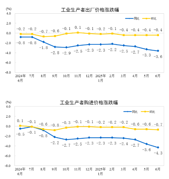 2025年6月份,全國工業(yè)生產(chǎn)者出廠價格同比下降3.6%,環(huán)比下降0.4%;工業(yè)生產(chǎn)者購進價格同比下降4.3%,環(huán)比下降0.7%。上半年,工業(yè)生產(chǎn)者出廠價格比上年同期下降2.8%,工業(yè)生產(chǎn)者購進價格下降2.9%。