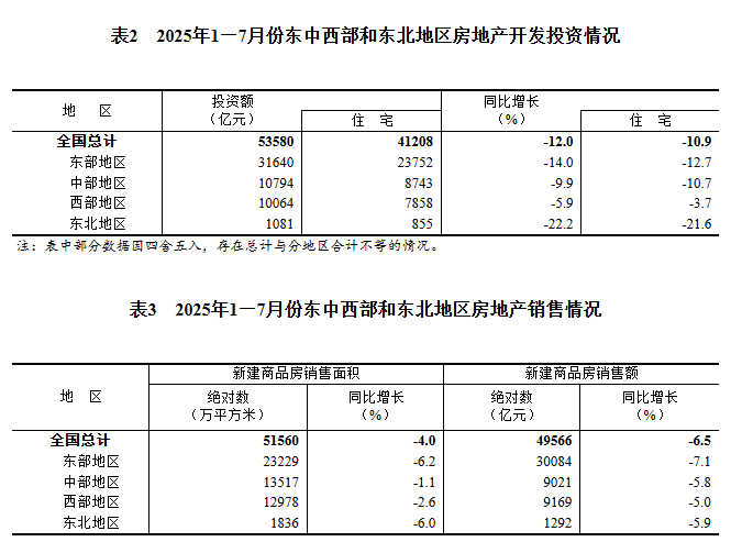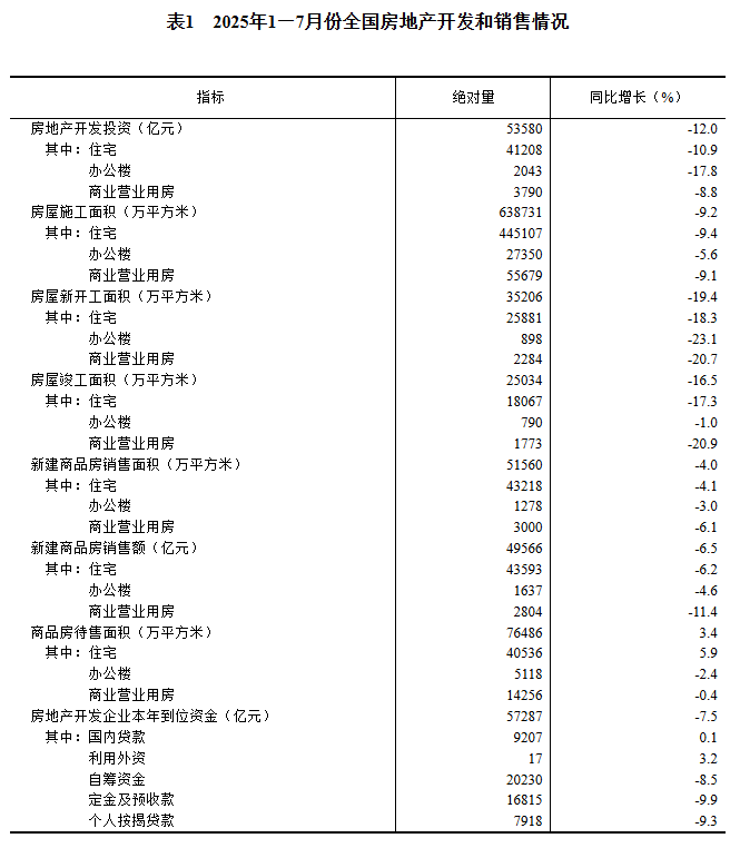 1—7月份,全國(guó)房地產(chǎn)開(kāi)發(fā)投資53580億元,同比下降12.0%(按可比口徑計(jì)算,詳見(jiàn)附注6);其中,住宅投資41208億元,下降10.9%。