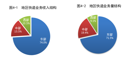 1—7月,東、中、西部地區(qū)快遞業(yè)務(wù)收入比重分別為74.0%、15.5%和10.5%,快遞業(yè)務(wù)量比重分別為71.5%、19.4%和9.1%。與去年同期相比,東部地區(qū)快遞業(yè)務(wù)收入比重下降0.8個百分點,快遞業(yè)務(wù)量比重下降1.4個百分點;中部地區(qū)快遞業(yè)務(wù)收入比重上升0.5個百分點,快遞業(yè)務(wù)量比重上升0.9個百分點;西部地區(qū)快遞業(yè)務(wù)收入比重上升0.3個百分點,快遞業(yè)務(wù)量比重上升0.5個百分點。