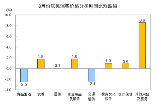 8月份,食品煙酒類價(jià)格同比下降2.5%,影響CPI(居民消費(fèi)價(jià)格指數(shù))下降約0.72個(gè)百分點(diǎn)。食品中,鮮菜價(jià)格下降15.2%,影響CPI下降約0.37個(gè)百分點(diǎn);蛋類價(jià)格下降12.4%,影響CPI下降約0.08個(gè)百分點(diǎn);畜肉類價(jià)格下降8.0%,影響CPI下降約0.25個(gè)百分點(diǎn),其中豬肉價(jià)格下降16.1%,影響CPI下降約0.24個(gè)百分點(diǎn);鮮果價(jià)格下降3.7%,影響CPI下降約0.08個(gè)百分點(diǎn);糧食價(jià)格下降0.8%,影響CPI下降約0.01個(gè)百分點(diǎn);水產(chǎn)品價(jià)格上漲2.2%,影響CPI上漲約0.04個(gè)百分點(diǎn)。