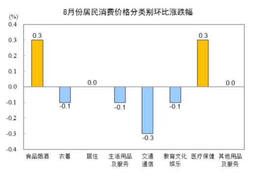 8月份,全國(guó)居民消費(fèi)價(jià)格環(huán)比持平。其中,城市持平,農(nóng)村上漲0.1%;食品價(jià)格上漲0.5%,非食品價(jià)格下降0.1%;消費(fèi)品價(jià)格上漲0.1%,服務(wù)價(jià)格持平。