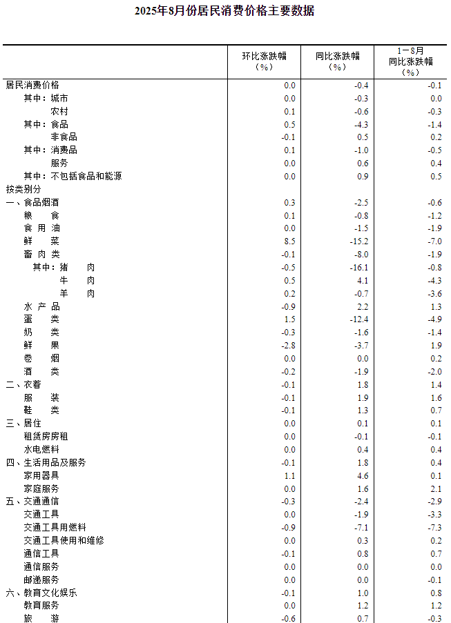 2025年8月份,全國(guó)居民消費(fèi)價(jià)格同比下降0.4%。其中,城市下降0.3%,農(nóng)村下降0.6%;食品價(jià)格下降4.3%,非食品價(jià)格上漲0.5%;消費(fèi)品價(jià)格下降1.0%,服務(wù)價(jià)格上漲0.6%。1—8月平均,全國(guó)居民消費(fèi)價(jià)格比上年同期下降0.1%。