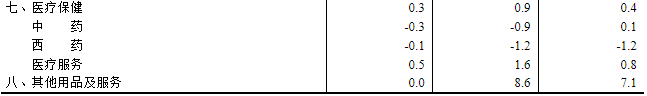 其他七大類價(jià)格環(huán)比一漲兩平四降。其中,醫(yī)療保健價(jià)格上漲0.3%;居住、其他用品及服務(wù)價(jià)格均持平;交通通信價(jià)格下降0.3%,衣著、生活用品及服務(wù)、教育文化娛樂價(jià)格均下降0.1%。