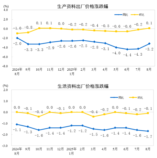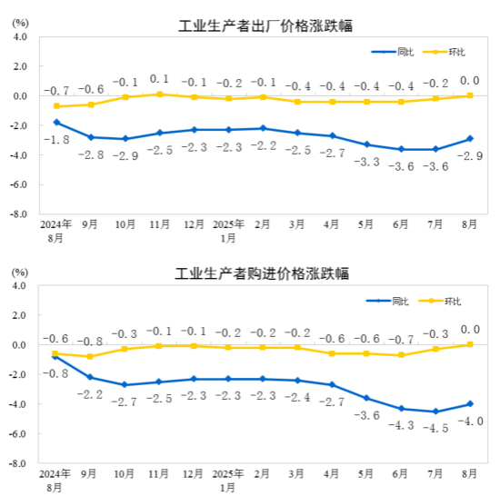 2025年8月份,全國工業(yè)生產(chǎn)者出廠價格同比下降2.9%,降幅比上月收窄0.7個百分點,環(huán)比由下降0.2%轉(zhuǎn)為持平。工業(yè)生產(chǎn)者購進(jìn)價格同比下降4.0%,環(huán)比持平。1—8月平均,工業(yè)生產(chǎn)者出廠價格比上年同期下降2.9%,工業(yè)生產(chǎn)者購進(jìn)價格下降3.3%。