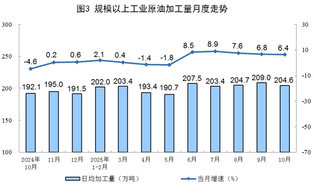 原油加工平穩(wěn)增長(zhǎng)。10月份,規(guī)上工業(yè)原油加工量6343萬(wàn)噸,同比增長(zhǎng)6.4%;日均加工204.6萬(wàn)噸。