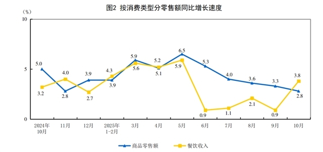 按消費類型分,10月份,商品零售額41092億元,同比增長2.8%;餐飲收入5199億元,增長3.8%。1—10月份,商品零售額365981億元,增長4.4%;餐飲收入46188億元,增長3.3%。