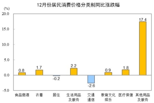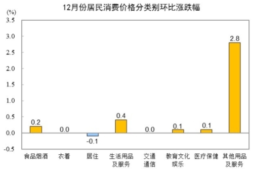 12月份,全國居民消費價格環(huán)比上漲0.2%。其中,城市上漲0.2%,農(nóng)村上漲0.2%;食品價格上漲0.3%,非食品價格上漲0.1%;消費品價格上漲0.3%,服務(wù)價格持平。