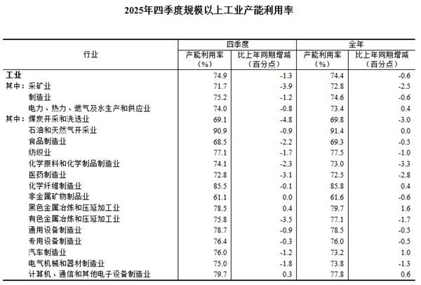 2025年四季度,全國(guó)規(guī)模以上工業(yè)產(chǎn)能利用率為74.9%,比三季度上升0.3個(gè)百分點(diǎn),比上年同期下降1.3個(gè)百分點(diǎn)。2025年全國(guó)規(guī)模以上工業(yè)產(chǎn)能利用率為74.4%。