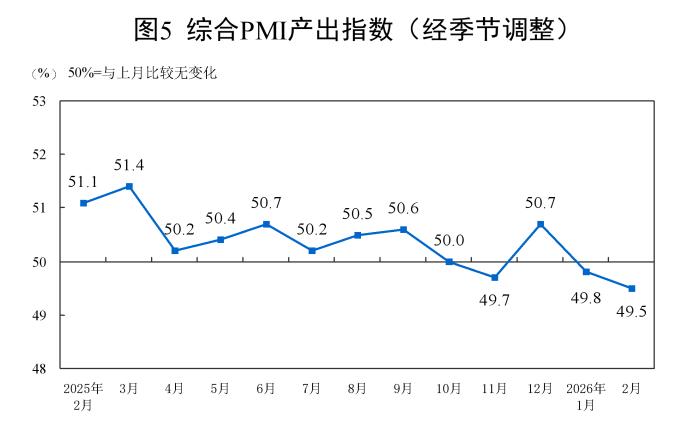 2月份,綜合PMI產(chǎn)出指數(shù)為49.5%,比上月下降0.3個(gè)百分點(diǎn),表明我國企業(yè)生產(chǎn)經(jīng)營活動(dòng)總體較上月有所放緩。