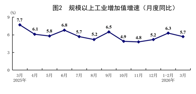 一季度,全國(guó)規(guī)模以上工業(yè)增加值同比增長(zhǎng)6.1%,比上年四季度加快1.1個(gè)百分點(diǎn)。分三大門(mén)類看,采礦業(yè)增加值同比增長(zhǎng)6.0%,制造業(yè)增長(zhǎng)6.4%,電力、熱力、燃?xì)饧八a(chǎn)和供應(yīng)業(yè)增長(zhǎng)4.3%。裝備制造業(yè)增加值同比增長(zhǎng)8.9%,高技術(shù)制造業(yè)增加值增長(zhǎng)12.5%,分別快于全部規(guī)模以上工業(yè)增加值2.8和6.4個(gè)百分點(diǎn)。分經(jīng)濟(jì)類型看,國(guó)有控股企業(yè)增加值同比增長(zhǎng)4.8%;股份制企業(yè)增長(zhǎng)6.6%,外商及港澳臺(tái)投資企業(yè)增長(zhǎng)3.9%;私營(yíng)企業(yè)增長(zhǎng)6.1%。分產(chǎn)品看,3D打印設(shè)備、鋰離子電池、工業(yè)機(jī)器人產(chǎn)品產(chǎn)量同比分別增長(zhǎng)54.0%、40.8%、33.2%。3月份,規(guī)模以上工業(yè)增加值同比增長(zhǎng)5.7%,環(huán)比增長(zhǎng)0.28%。3月份,制造業(yè)采購(gòu)經(jīng)理指數(shù)為50.4%,比上月上升1.4個(gè)百分點(diǎn);企業(yè)生產(chǎn)經(jīng)營(yíng)活動(dòng)預(yù)期指數(shù)為53.4%。1—2月份,全國(guó)規(guī)模以上工業(yè)企業(yè)實(shí)現(xiàn)利潤(rùn)總額10246億元,同比增長(zhǎng)15.2%。