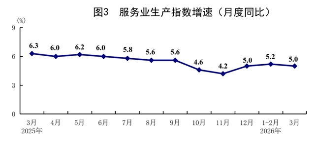 一季度,服務(wù)業(yè)增加值同比增長(zhǎng)5.2%。其中,租賃和商務(wù)服務(wù)業(yè),信息傳輸、軟件和信息技術(shù)服務(wù)業(yè),金融業(yè),交通運(yùn)輸、倉(cāng)儲(chǔ)和郵政業(yè),住宿和餐飲業(yè)增加值分別增長(zhǎng)12.2%、10.6%、6.5%、4.3%、4.3%。3月份,全國(guó)服務(wù)業(yè)生產(chǎn)指數(shù)同比增長(zhǎng)5.0%。其中,信息傳輸、軟件和信息技術(shù)服務(wù)業(yè),租賃和商務(wù)服務(wù)業(yè),金融業(yè)生產(chǎn)指數(shù)分別增長(zhǎng)11.8%、10.1%、6.7%。1—2月份,規(guī)模以上服務(wù)業(yè)企業(yè)營(yíng)業(yè)收入同比增長(zhǎng)7.4%。3月份,服務(wù)業(yè)商務(wù)活動(dòng)指數(shù)為50.2%,比上月上升0.5個(gè)百分點(diǎn);服務(wù)業(yè)業(yè)務(wù)活動(dòng)預(yù)期指數(shù)為54.8%。其中,鐵路運(yùn)輸、電信廣播電視及衛(wèi)星傳輸服務(wù)、貨幣金融服務(wù)、保險(xiǎn)等行業(yè)商務(wù)活動(dòng)指數(shù)位于55.0%以上較高景氣區(qū)間。
