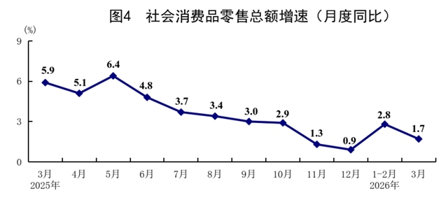 一季度,社會(huì)消費(fèi)品零售總額127695億元,同比增長(zhǎng)2.4%,比上年四季度加快0.7個(gè)百分點(diǎn)。按經(jīng)營(yíng)單位所在地分,城鎮(zhèn)消費(fèi)品零售額110574億元,同比增長(zhǎng)2.3%;鄉(xiāng)村消費(fèi)品零售額17121億元,增長(zhǎng)3.1%。按消費(fèi)類型分,商品零售額113072億元,增長(zhǎng)2.2%;餐飲收入14623億元,增長(zhǎng)4.2%。基本生活類和部分升級(jí)類商品銷售增長(zhǎng)較快,限額以上單位糧油食品類、服裝鞋帽針紡織品類、通訊器材類、金銀珠寶類商品零售額同比分別增長(zhǎng)10.0%、9.3%、20.8%、12.6%。3月份,社會(huì)消費(fèi)品零售總額同比增長(zhǎng)1.7%,環(huán)比增長(zhǎng)0.14%。一季度,服務(wù)零售額同比增長(zhǎng)5.5%,增速與上年全年持平。其中,通訊信息服務(wù)類、旅游咨詢租賃服務(wù)類、文體休閑服務(wù)類零售額較快增長(zhǎng)。一季度,全國(guó)網(wǎng)上商品和服務(wù)零售額49774億元,同比增長(zhǎng)8.0%。其中,網(wǎng)上商品零售額31614億元,增長(zhǎng)7.5%,占社會(huì)消費(fèi)品零售總額的比重為24.8%;網(wǎng)上服務(wù)零售額18160億元,增長(zhǎng)8.8%。